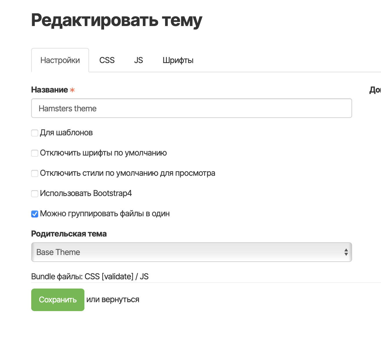 Создайте ещё одну тему и назовите её, например, именем вашей школы. В выпадающем списке «Родительская тема» выберите тему, в которую вы установили стили и скрипты набора: